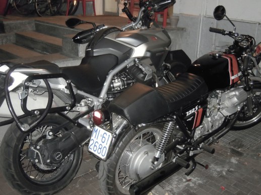 The bike suddenly stopped, Antonio Farinazzo joined me 12 minutes after my phone call, with all his incomparable bike wisdom. “Hmmmm, it must be a fuse”. Yes, it was an insignificant fuse, but it was also the even less significant couple of levers that keep the fuse in its place – well, should keep it… Antonio’s “instant and made to measure” solution was fair enough to bring me back home. But the “accrocchio” would not work for a long time: to bring back all 750 S’ reliability we need a brand new fuse box, and we we don’t have it, neither I have time to wait for it, the countdown is running and sunday morning I have to start the journey. The Stelvio is much newer (2011), much more comfortable, much more powerful (1200 cc), much more reliable, and it is still a Moto Guzzi. But this is going to be a night of regret.